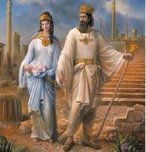 Emperor Cyrus the Great with his beloved Shahbanu, Empress Cassandane.Cyrus was preceded as king by his father Cambyses I, grandfather Cyrus I, and great-grandfather. Cyrus married Cassandane who was an Achaemenian and the daughter of Pharnaspes who bore him two sons, Cambyses II and Bardiya along with three daughters, Atossa, Artystone, and Roxane. Cyrus and Cassandane were known to love each other very much Cassandane said that she found it more bitter to leave Cyrus than to depart her life.The name "Cassandane" later evolved to "Cassandra" means: "Creation of Glory" in Old Persian .