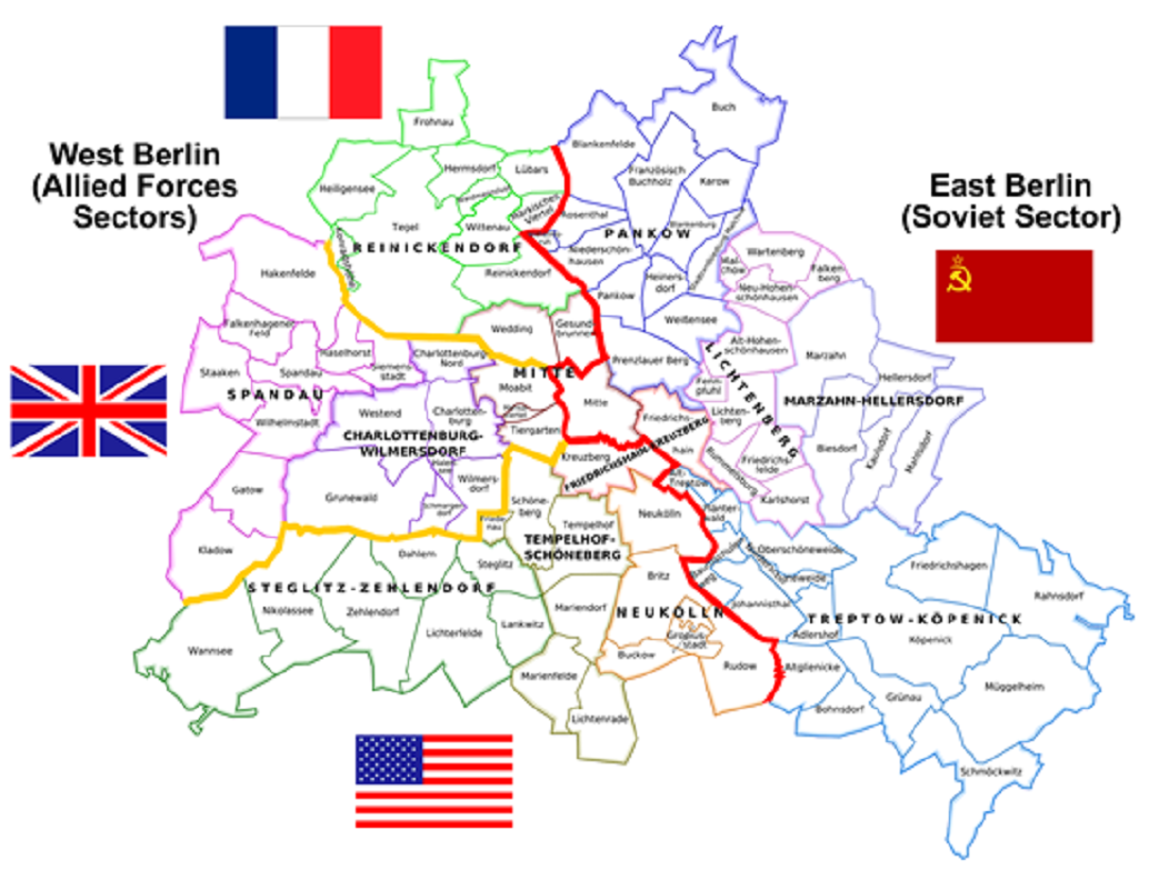AFTER ADOLF HITLER DEATH IN 1945,ALLIED PREPARATIONS FOR OCCUPATION OF GERMANY,AS RUSSIA DOMINANCE IN THE EAST.THE RED ARMY HAD MARCHER IN TO BERLIN ,WHICH WAS DIVIDED IN FOUR SPHERE OF INFLUENCE ,USA,BRITAIN,FRANCE AND SOVIET.EVEN IF ALL THESE SECTORS WHERE SO CLOSE TO EACH OTHER,THEY STILL HAD ENORMOUS DIFFERENCES.