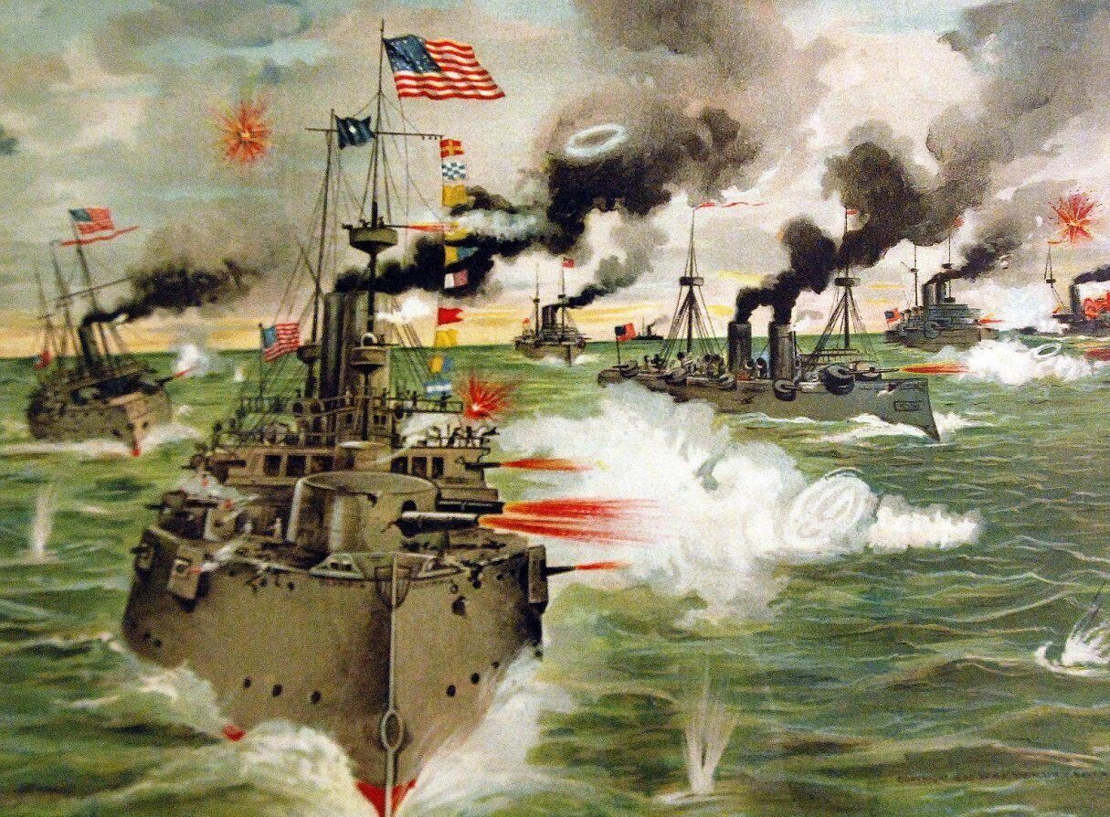 American people support Cuban rebels against Spain. American business sees economic gain in Cuban trade and resources and American power zones in Latin America. Outstanding events: Submarine mine sinks U.S. battleship Maine in Havana Harbor (Feb. 15); 260 killed; responsibility never fixed. Congress declares independence of Cuba (April 19). Spain declares war on U.S. (April 24); Congress (April 25) formally declares nation has been at war with Spain since April 21. Commodore George Dewey wins seven-hour battle of Manila Bay (May 1). Spanish fleet destroyed off Santiago, Cuba (July 3); city surrenders (July 17). Treaty of Paris (ratified by Senate 1899) ends war. U.S. given Guam and Puerto Rico and agrees to pay Spain $20 million for Philippines. Cuba independent of Spain; under U.S. military control for three years until May 20, 1902. Yellow fever is eradicated and political reforms achieved.